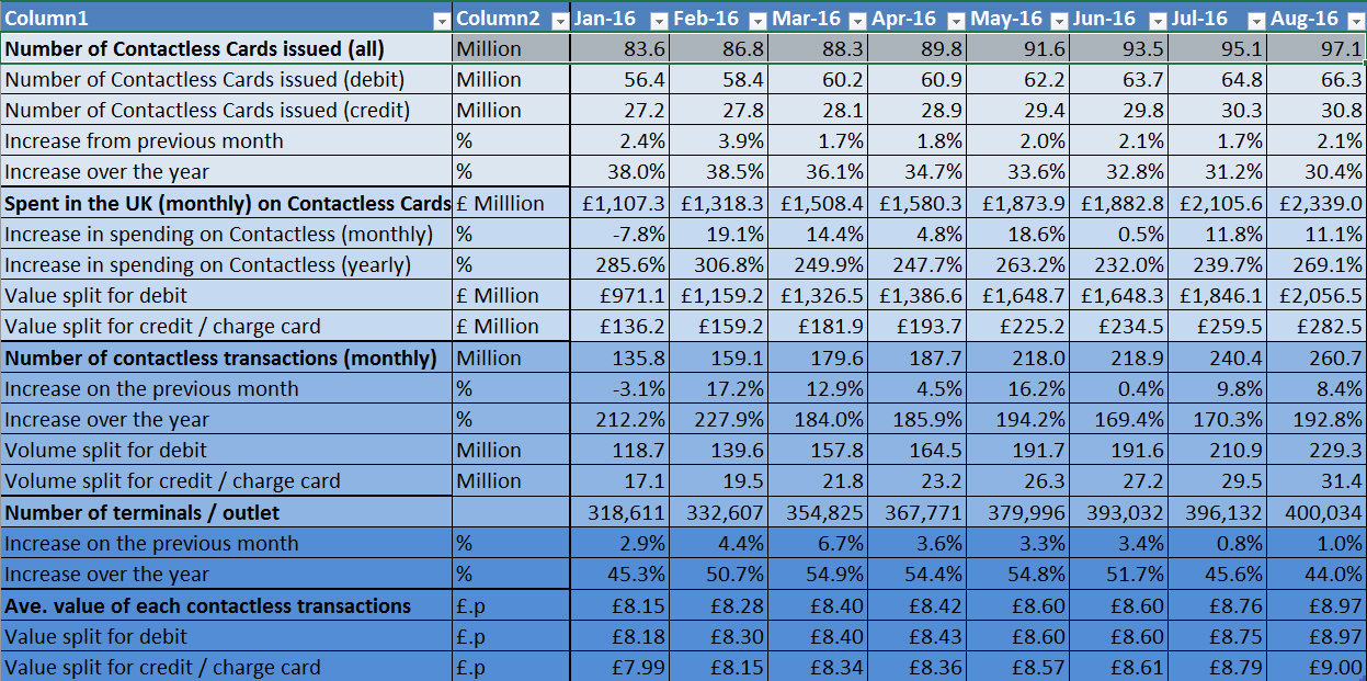 Tháng 11/2016 đánh dấu sự tăng trưởng mạnh mẽ của thanh toán không tiếp xúc, tổng giá trị giao dịch bằng công nghệ này đã đạt mức kỷ lục 2,9 tỷ £ trong tháng 11. Tổng giá trị giao dịch đã tăng 184% so với năm ngoái khi chi tiêu thanh toán không tiếp xúc lần đầu tiên đạt mức 1 tỷ £ trong tháng.