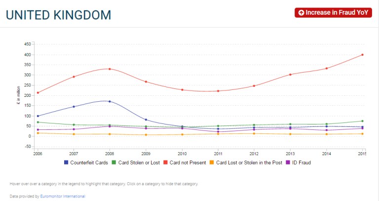 - Chi tiêu thực trong thương mại điện tử ở Anh là 41 tỷ Bảng vào năm 2008, khi gian lận thẻ của Anh đạt đỉnh. Con số này đã lên đến 210 tỷ Bảng vào năm 2015 và 248 tỷ Bảng vào năm 2016, theo số liệu của Cơ quan Chống gian lận Tài chính Vương quốc Anh (Financial Fraud Action UK).