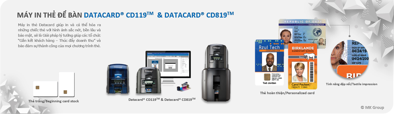 Những chiếc máy in thẻ nổi tiếng MK Group đã cung cấp và được nhiều tổ chức đánh giá cao phải kể đến các dòng máy in thẻ để bàn Datacard® SP, Datacard® SD, Datacard® SR và đặc biệt là dòng máy in thẻ để bàn mới nhất hiện nay là Datacard® CD 119 và Datacard® CD 819.