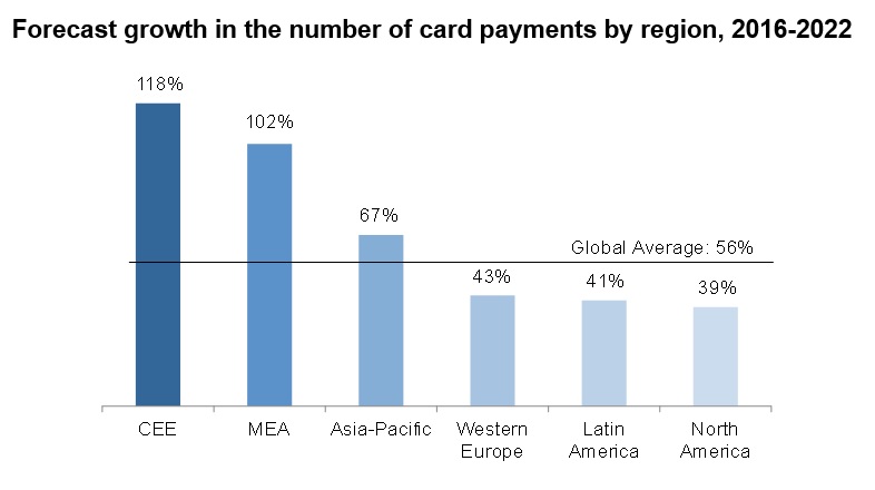 Tất cả các khu vực sẽ nhận thấy số lượng các khoản thanh toán thẻ tăng nhanh hơn so với số lượng thẻ. Ở cả Trung Đông, Châu Phi (MEA), Trung Âu và Đông Âu (CEE), dự báo tổng số lượng thanh toán thẻ sẽ tăng gấp đôi trong khoảng thời gian 2016 và 2022. Người dân tại các khu vực này không sử dụng thẻ để thanh toán thường xuyên như tại Bắc Mỹ và Tây Âu. Nghiên cứu gợi ý rằng các chương trình tài chính và sự gia tăng chấp nhận thẻ tại các thị trường đang phát triển sẽ là nhân tố chung trong việc thúc đẩy người tiêu dùng sử dụng thẻ thanh toán.