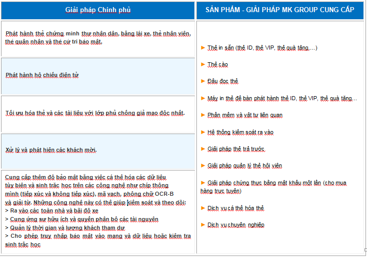 MK Group tự hào là đối tác chiến lược được công nhận của tập đoàn Entrust Datacard, tên tuổi đã có mặt trên 70 quốc gia với các sản phẩm thẻ ID bảo mật cao và nhiều công nghệ thẻ tiên tiến khác. Nhờ vậy, Chính phủ hoàn toàn tin tưởng vào MK Group vào các dự án và mục tiêu cần thực hiện trong lĩnh vực mà MKG cung cấp: