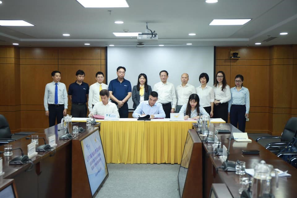 Từ phải qua trái: Bà Hà Thị Hòa - Tổng Giám đốc Tổng công ty Chuyển phát nhanh Bưu điện (EMS), Ông Nguyễn Quốc Bảo - Phó tổng Giám đốc thường trực MK Smart, Ông Nguyễn Anh Tuấn - Tổng Giám đốc Công ty cổ phần Truyền thông quảng cáo Bưu chính (Media Post) cùng các đại diện của MK Smart và VN Post