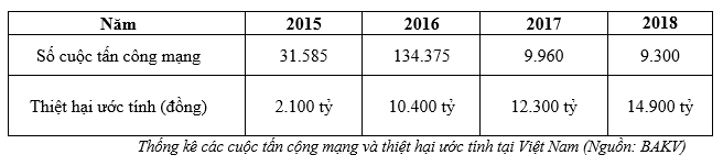Tại Việt Nam, theo thống kê của Cục An toàn Thông tin và công ty an ninh mạng BKAV, nước ta trong 4 năm gần đây đã hứng chịu hàng chục nghìn vụ tấn công mạng bằng nhiều hình thức khác nhau, trong đó chủ yếu là các thủ đoạn như tấn công lừa đảo (phishing), phát tán mã độc (malware) và thay đổi giao diện (deface), với thiệt hại ước tính lên đến gần 15 nghìn tỷ đồng trong năm 2018, tương đương 0.26% GDP. Thống kê cũng cho thấy, đã có hơn 1,6 triệu máy tính ở Việt Nam bị mất dữ liệu, qua đó gây ra mối nguy hại lớn đối với an toàn thông tin mạng.