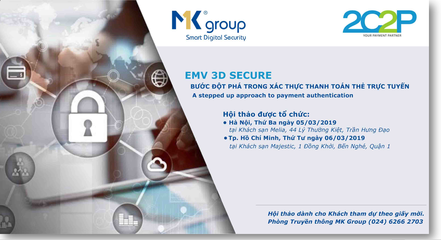 Với mong muốn giúp các tổ chức phát hành thẻ và ĐVCNT tiếp cận và hiểu sâu hơn về phiên bản EMV 3DS, Tập đoàn MK đã phối hợp với công ty 2C2P của Thái Lan – chuyên gia hàng đầu Đông Nam Á cung cấp các dịch vụ thanh toán để tổ chức Hội thảo “GIÁI PHÁP XÁC THỰC GIAO DỊCH TRỰC TUYẾN DÀNH CHO THẺ QUỐC TẾ - EMV 3D SECURE” tại: