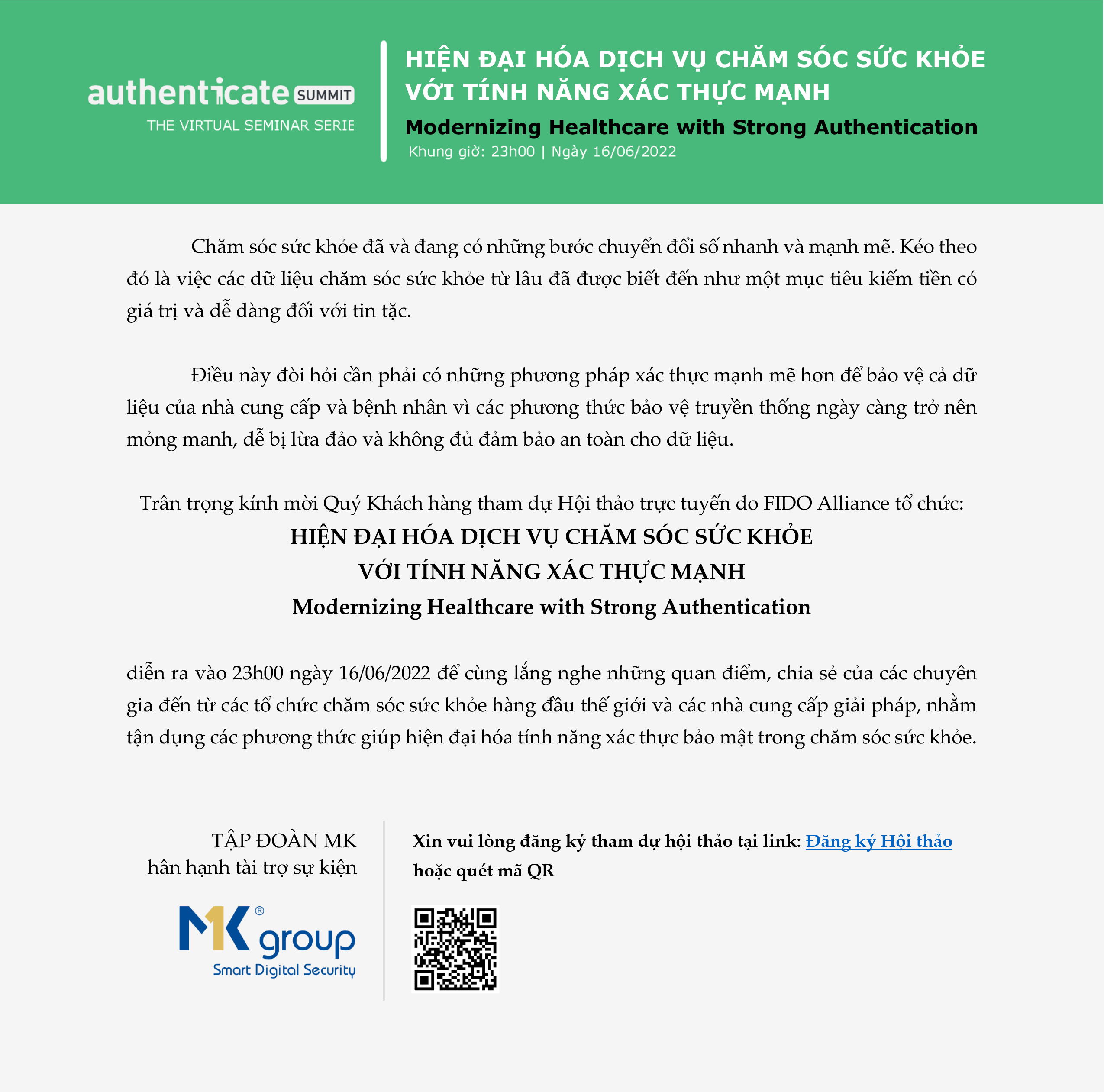 Hội thảo trực tuyến "Hiện đại hóa dịch vụ chăm sóc sức khỏe với tính năng xác thực mạnh" do FIDO Alliance tổ chức sẽ diễn ra vào 23h00 (GMT+7) ngày 16/6/2022.