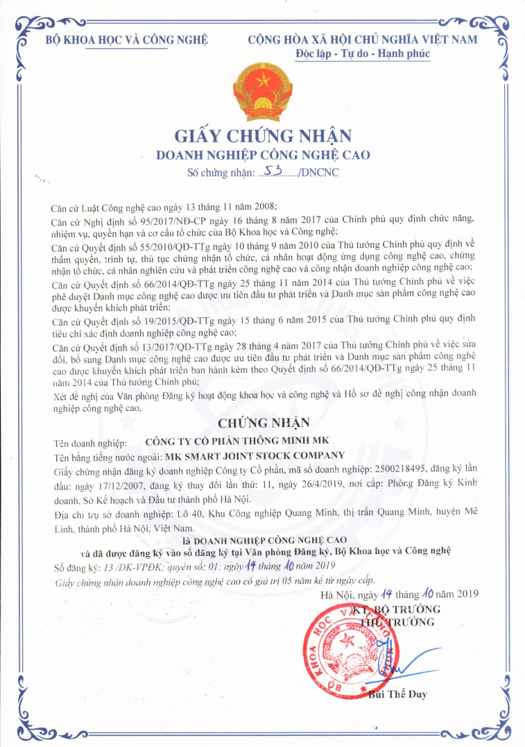 MK Smart được cấp chứng nhận Doanh nghiệp Công nghệ cao lần thứ hai