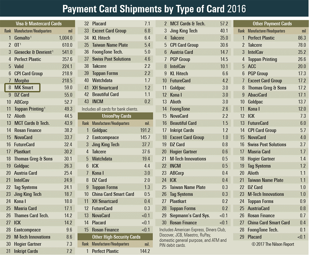 16/10/2017 00:00Ngày 18/9 Nilson Report đã công bố danh sách các nhà sản xuất thẻ thanh toán hàng đầu thế giới. Theo đó, MK Smart đứng trong TOP 15 với sản lượng 59 triệu thẻ thanh toán và đứng thứ 8 trong bảng xếp hạng sản xuất thẻ Visa và MasterCard.