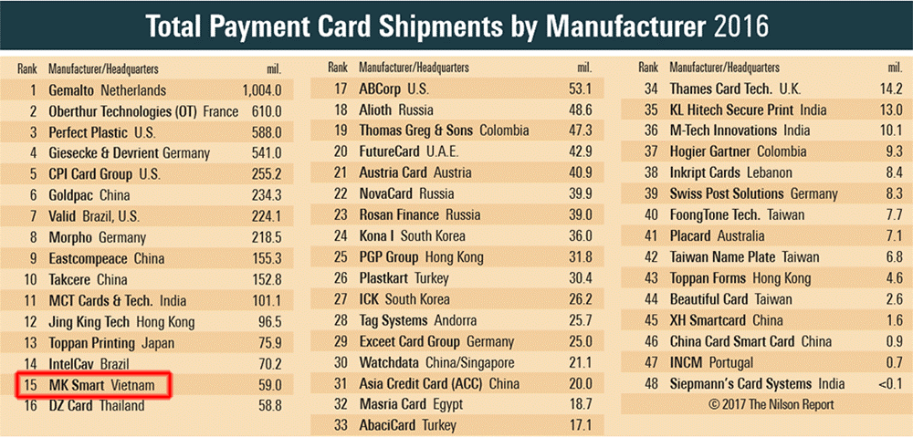 MK Smart trong TOP 15 nhà sản xuất thẻ thanh toán trên toàn cầu