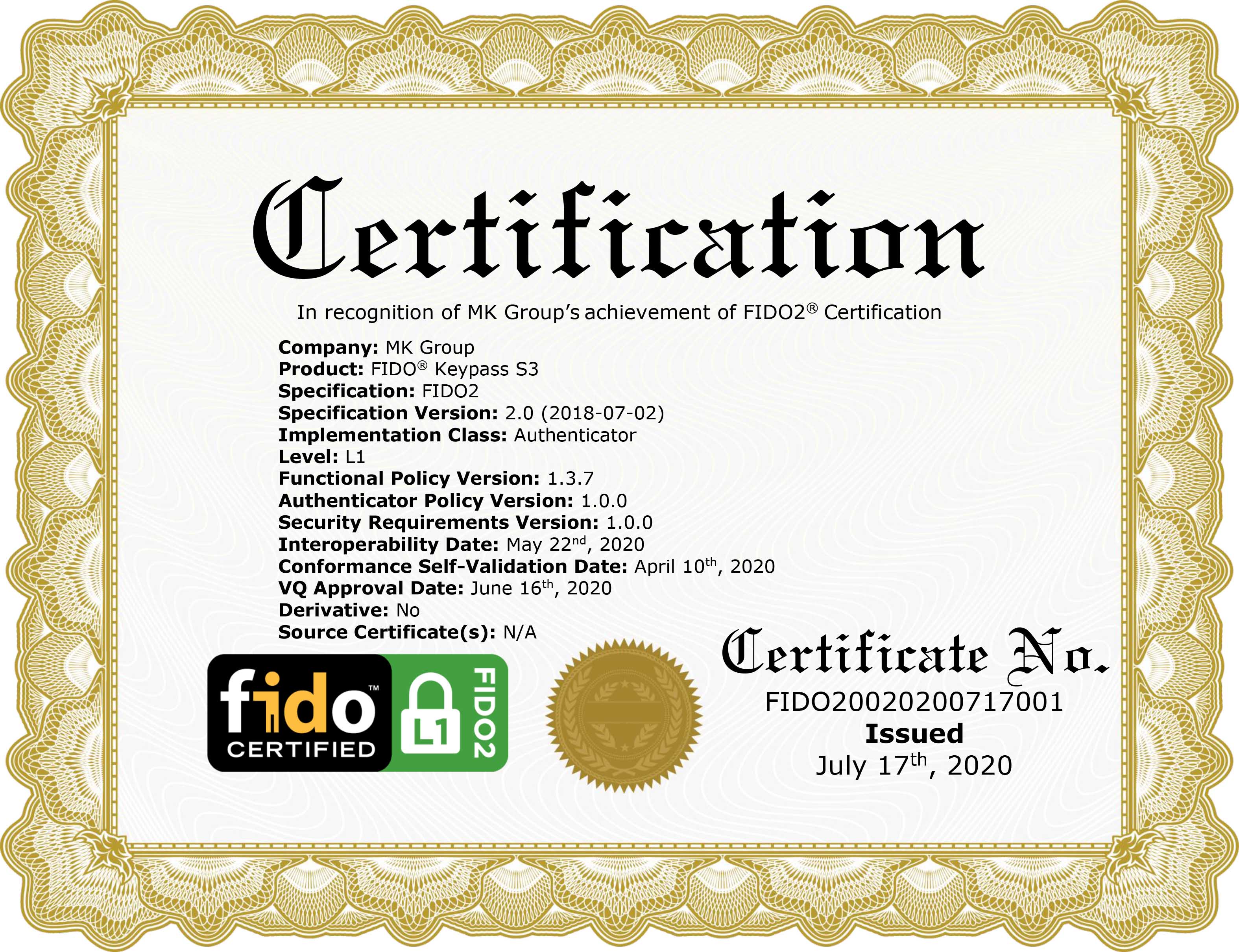 Thiết bị Khóa bảo mật FIDO® KeyPass S3 của MK Group đạt chứng nhận FIDO 2 của FIDO Alliance